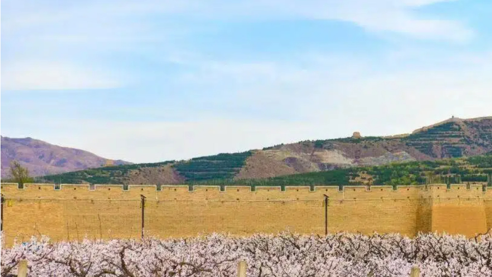 เมืองซั่วโจว มณฑลซานซี ดอกแอปริคอตบานสะพรั่งเชิงกำแพงเมืองจีน
