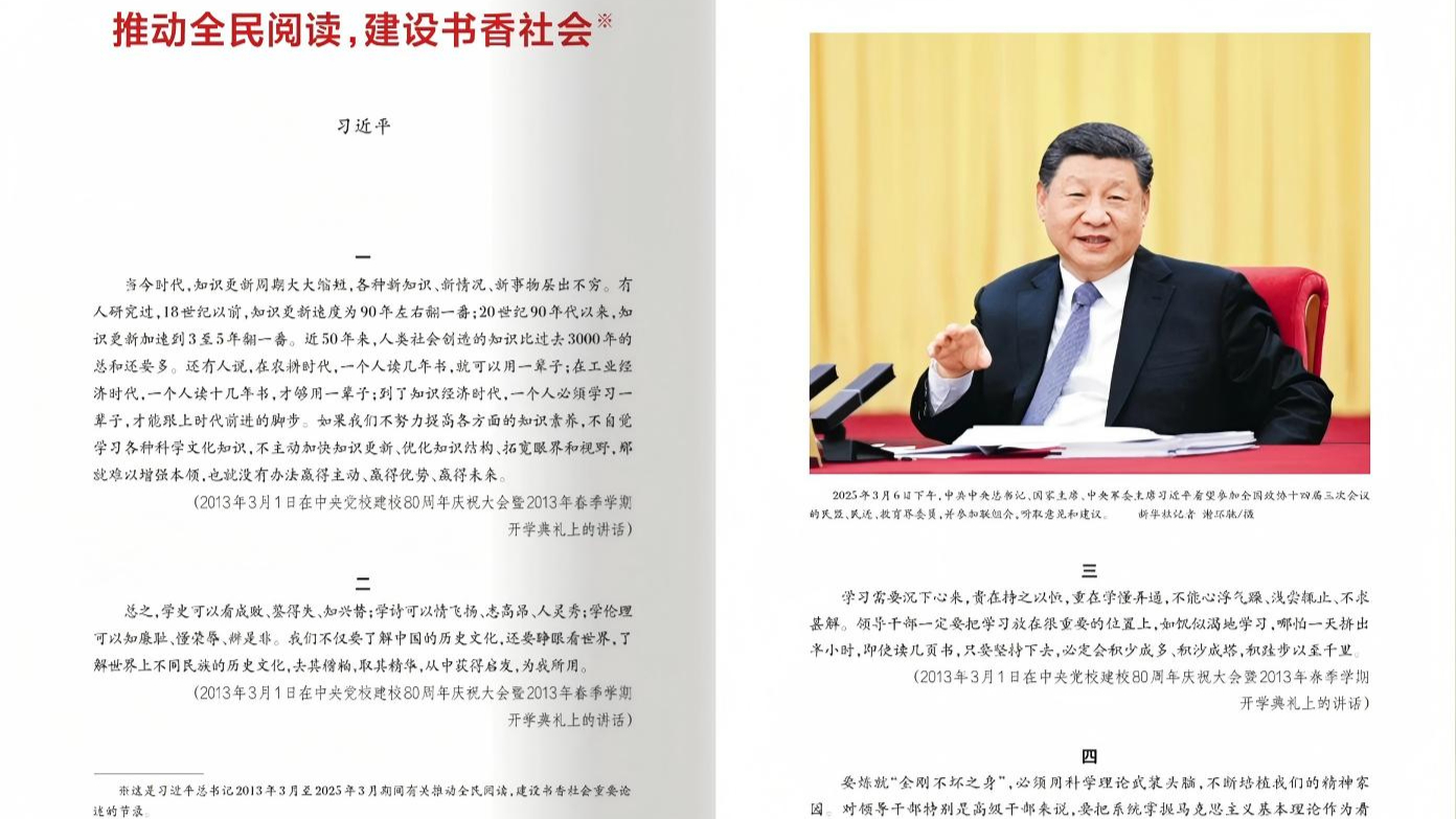 นิตยสาร “ฉิวซื่อ” เผยแพร่บทความสำคัญสีจิ้นผิง  “ส่งเสริมการอ่านทั่วสังคม สร้างสังคมที่อบอวลด้วยกลิ่นอายหนังสือ”